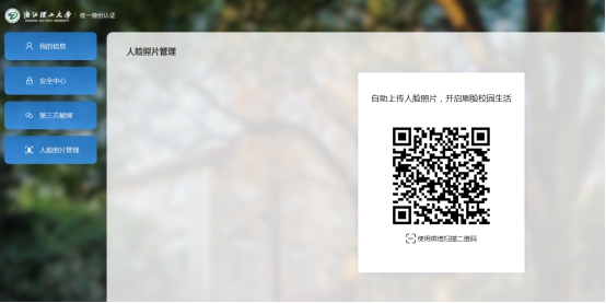 人脸照片的采集以自愿为原则,用户自愿选择是否将人脸照片上传到统一身份认证平台的人脸库。若选择上传,日后密码忘记时可以使用人脸识别找回密码,后续也可以应用到校内其他场景。