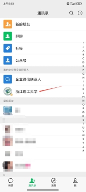 1、打开微信通讯录,找到并点击进入浙理工企业号。