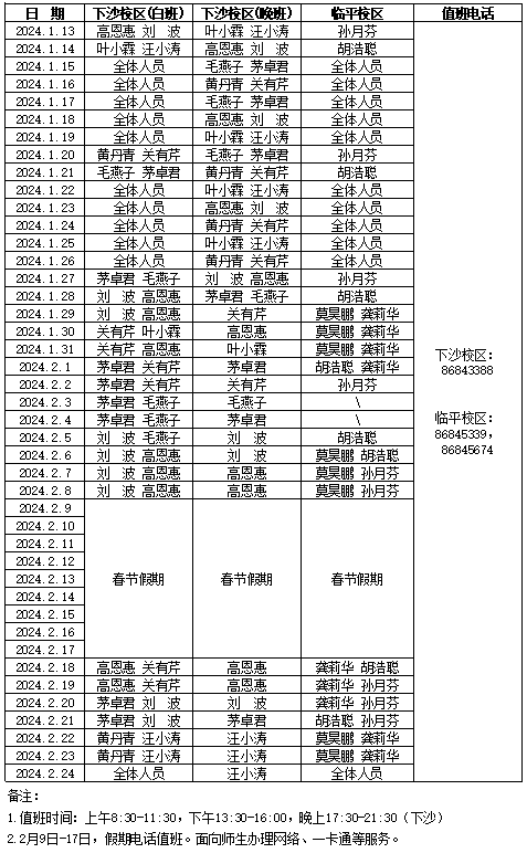 1.校园卡业务值班日期:1月15日-1月19日、1月22日-26日,其余时间每周二(2月13日除外)