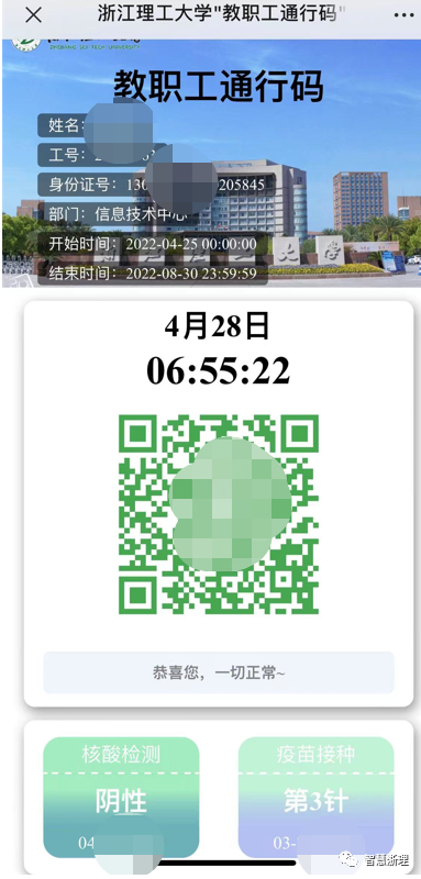 新系统将实时抓取省教育厅大数据中心健康码库信息,只要进校人员申领的省内任一地区健康码为非绿码,都将无法打开智慧校园通行码。新系统打通杭州健康码数据、浙理通行码审批数据、个人核酸检测数据与疫苗接种数据,实现通行码、核酸检测信息、疫苗接种信息“一屏显示”。