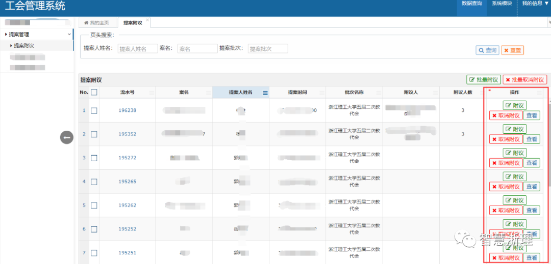 可在右侧的“操作”栏中,查看提案、附议提案、取消附议。