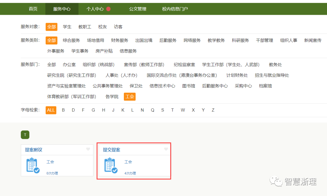 第一步,打开浙江理工大学校园网网上办事大厅-服务中心-工会-提交提案(建议用火狐、谷歌、360浏览器)。
