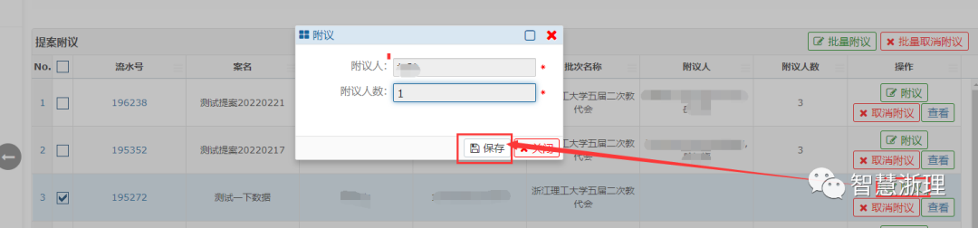 第二步,点击附议后,会自动出现本人姓名,点击保存后,完成提案的附议,如下图: