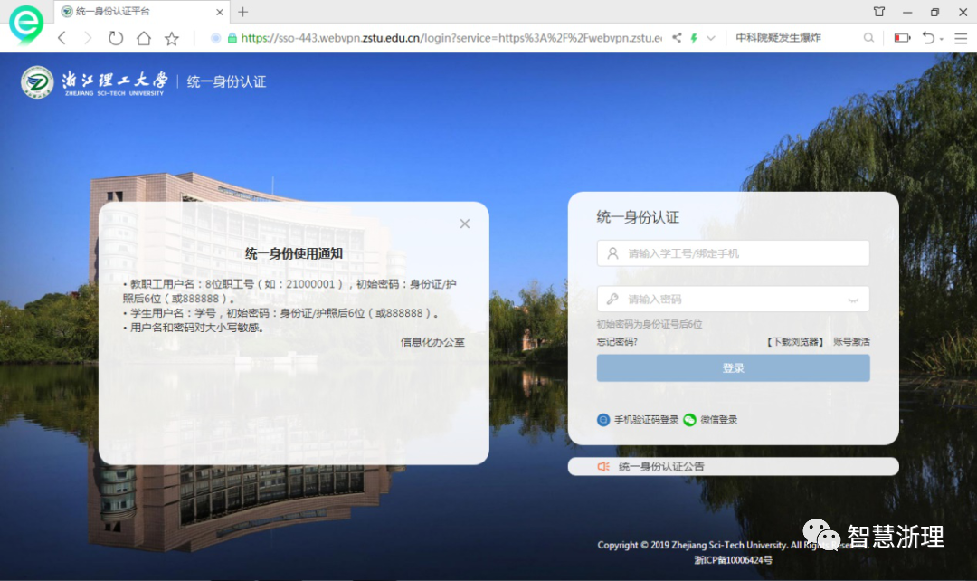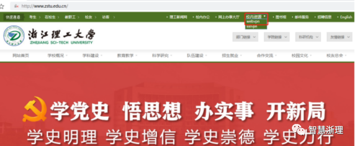 电脑或手机连接校外网络,在浏览器中打开学校主页(http://www.zstu.edu.cn),点击导航栏中的“校内资源”,再点击“webvpn”;或直接在浏览器输入https://webvpn.zstu.edu.cn,打开WebVPN。