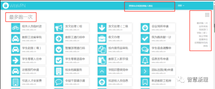 在WebVPN资源列表(此说明截图可能与实际可见的资源有差异,请以实际可见的资源列表为准)上点击某个校内网站资源,即可跳转至对应校内网站,已直接对外发布的有些校内网站不需要使用WebVPN,下载图书馆文献期刊资源请使用图书馆的vpn。可使用顶端搜索栏和右侧资源分类导航来快速定位校内网站资源。