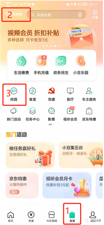 第二步:打开登录农行掌银APP,点击右下角“生活”,左上角选择“杭州市”,点击“校园”。