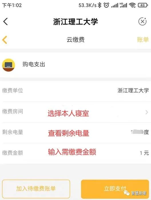 第七步:点击“缴费房间”,选择本人宿舍;然后在“缴费金额”中输入待缴费金额,点击“立即支付”跳转到农行支付页面,按农行支付界面提示完成支付。