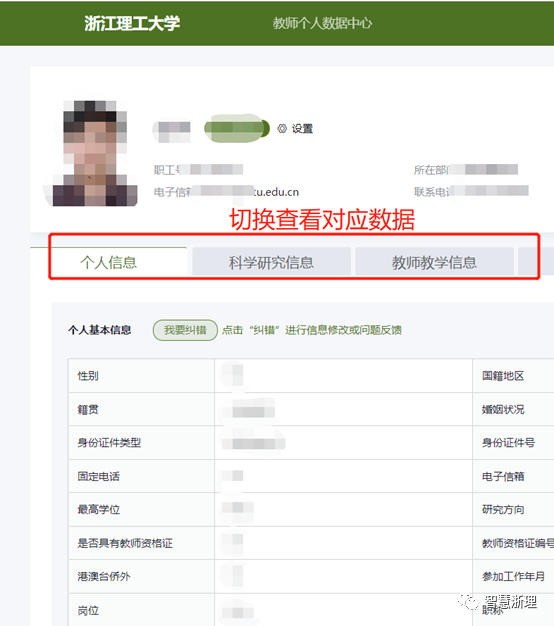校领导、学院(部)班子成员登录系统以后,点右上角头像切换身份为“校/院领导”,可以查看本单位所有教职工信息。