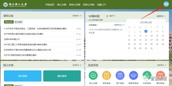 用浏览器(推荐使用谷歌浏览器或360浏览器的极速模式)打开学校官网上的“校内办公”网页,或直接在浏览器地址栏中输入校内办公网址:http://i.zstu.edu.cn/(注:处在校外网的电脑需先连接VPN),点击右上角的登录。