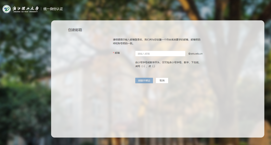 新入职的教职工统一身份认证账号激活后,首次登录SSO,会出现自定义邮箱名的页面,请输入一个邮箱名(由小写字母或数字开头,仅可包含小写字母、数字、下划线、减号(-)、点(.)),用于创建个人使用的学校邮箱。学生邮箱名默认使用学号。