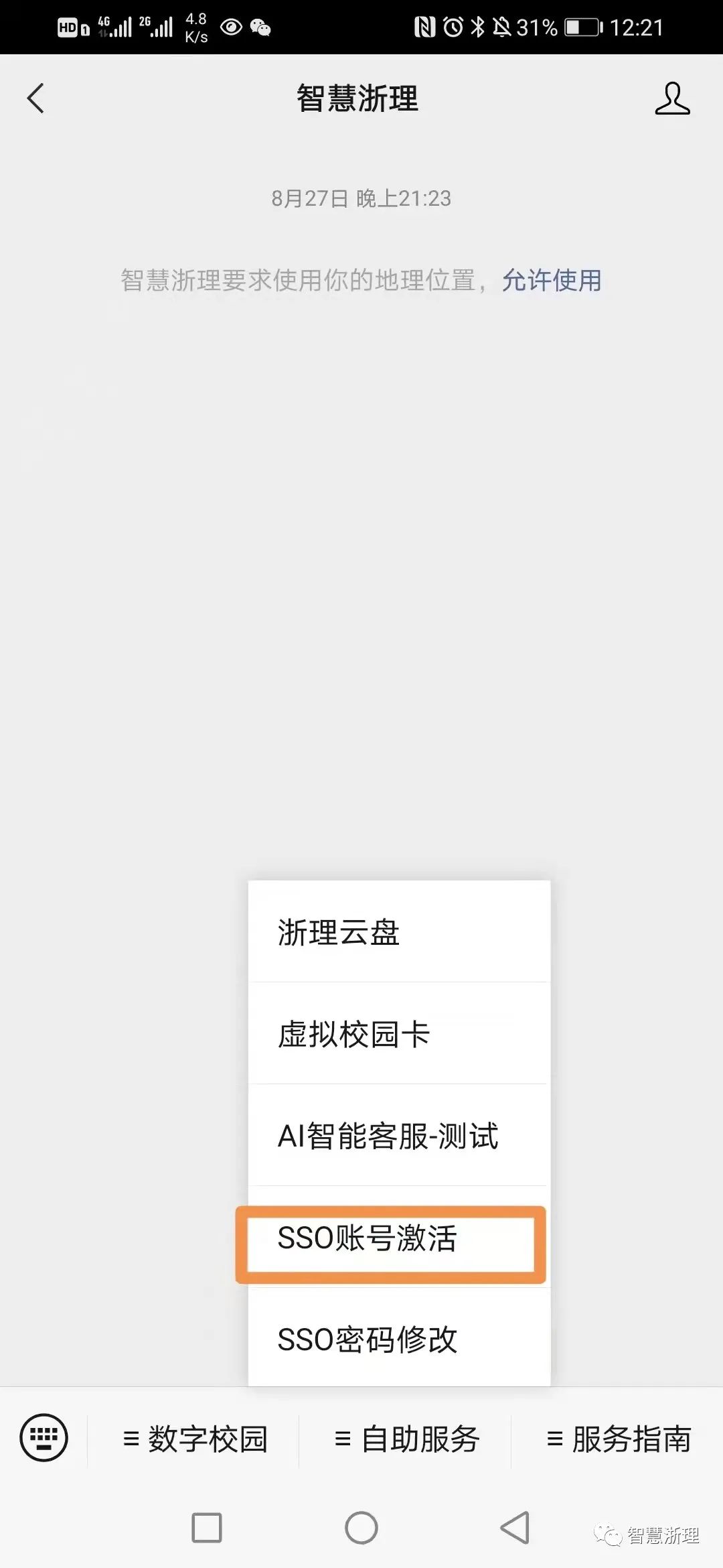 方式一:微信打开“智慧浙理”公众号,选择“自助服务”中的“SSO账号激活”。