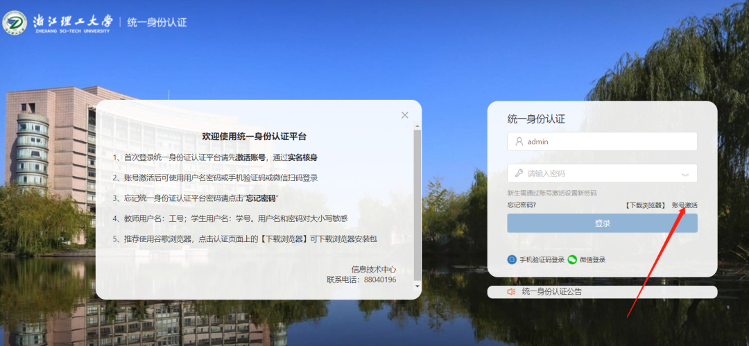 为建立健全数据安全协同治理体系,提高数据安全保障能力,9月1日《中华人民共和国数据安全法》正式发布施行,与此同时《个人信息保护法》也将于今年的11月1日正式施行。因此,为切实加强我校网络防护,提升师生个人信息安全,信息技术中心对学校原统一身份认证平台(sso.zstu.edu.cn)进行优化升级,明确首次登录须完成账号激活程序并通过实名核身。具体操作步骤如下: