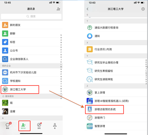 在校教职工进入浙江理工大学企业微信号,点击进入浙理访客预约系统发起预约申请