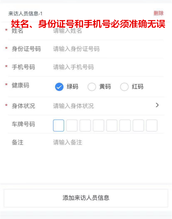 提示3:来访者的姓名、身份证号和手机号码务必填写准确。