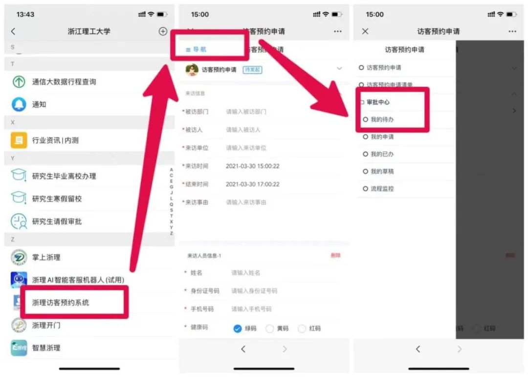 方式2:通过浙理访客预约系统→导航→我的待办 进入审批页面
