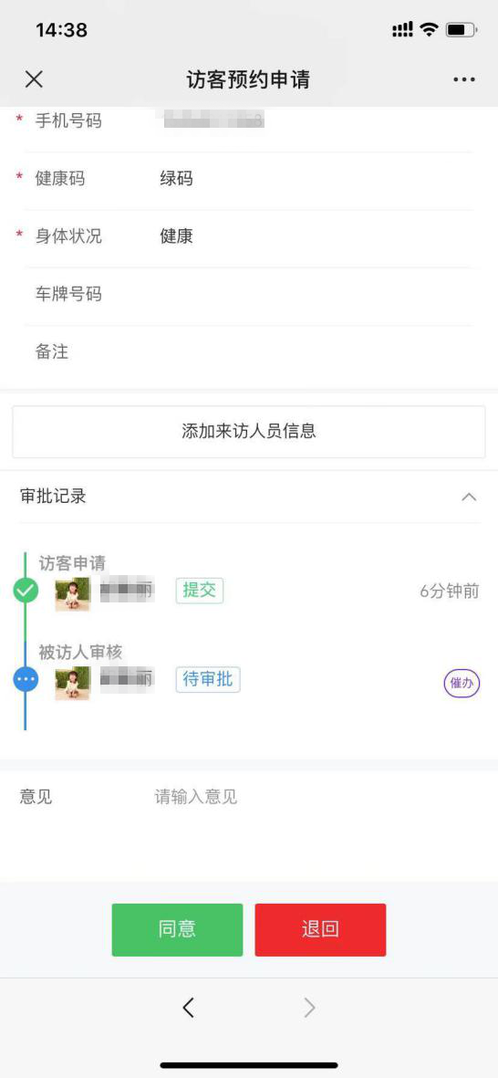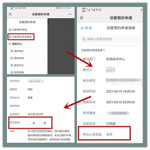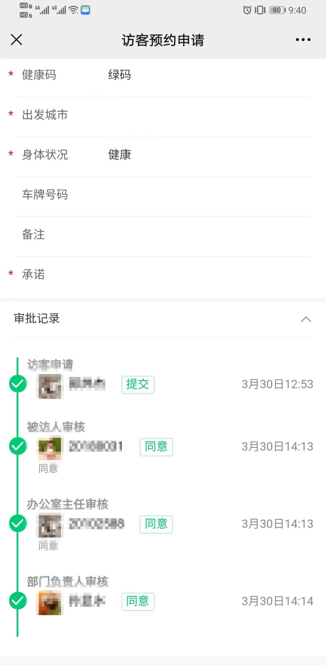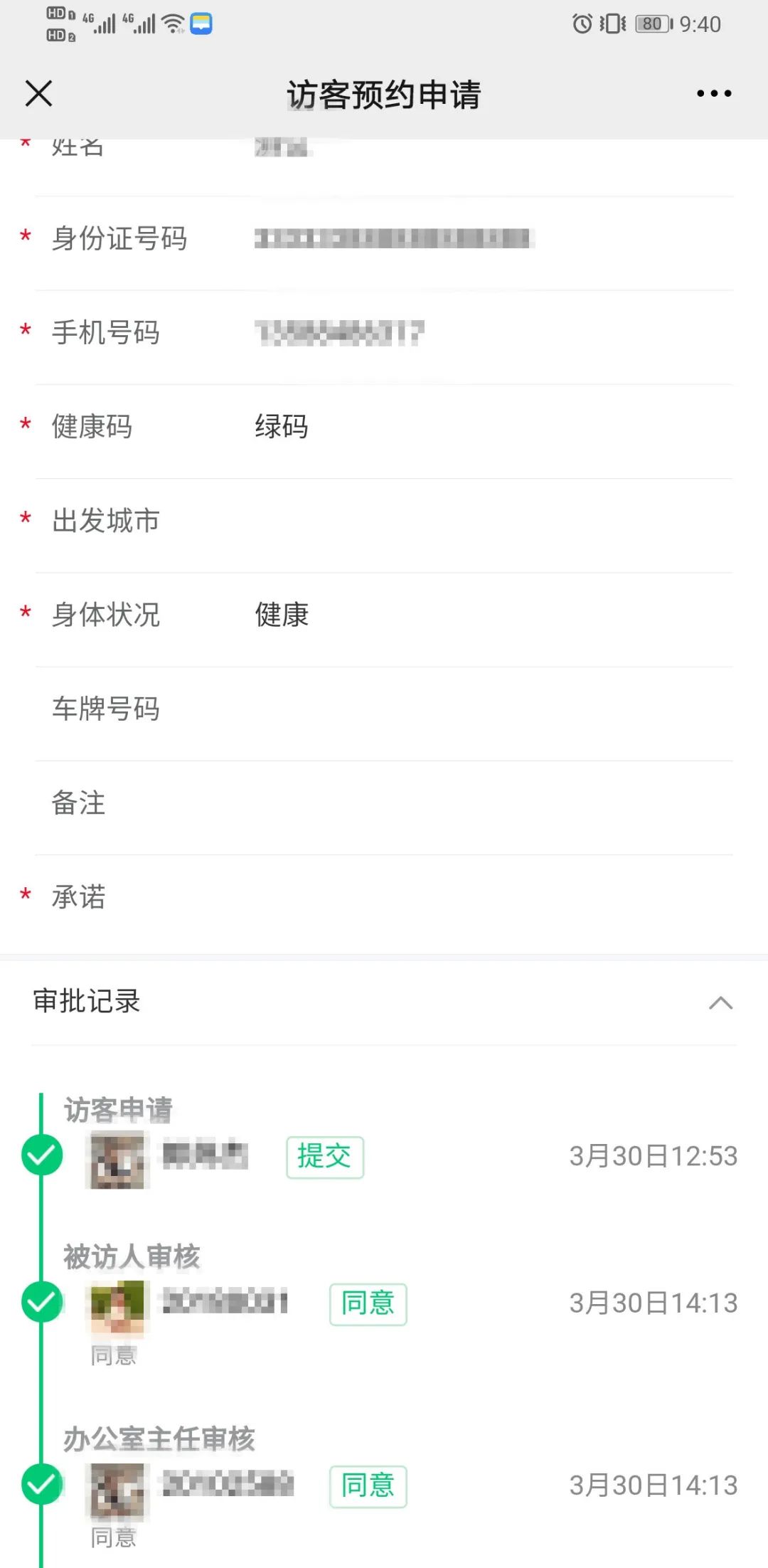 准确填写被访单位、被访人、来访人员等信息,点击提交,发起预约申请。