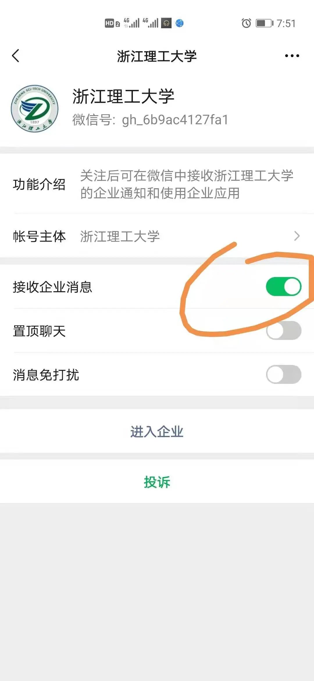 ① 如未收到申请相关信息提醒,请按下图所示在微信中进行设置,打开“接收企业消息”,不关闭“消息免打扰”。