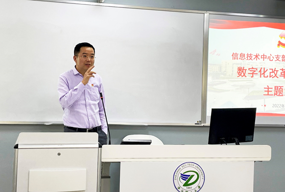 4月12日下午,信息技术中心党支部联合教务处党支部,在2S343沉浸式智慧教室,开展数字化改革联学联建主题活动。会议由教务处党支部书记王尧骏主持,信息技术中心党支部书记孙显水作“数字化改革在我校的实践与思考”主题分享。会议进一步开拓了党员们数字化改革工作思路,使大家对业务梳理在数字化改革中的关键作用,有了更深层次的理解,达到了两支部党建业务共建双促的预期效果,为两部门以数字化改革撬动管理服务效能提升,奠定了良好基础。