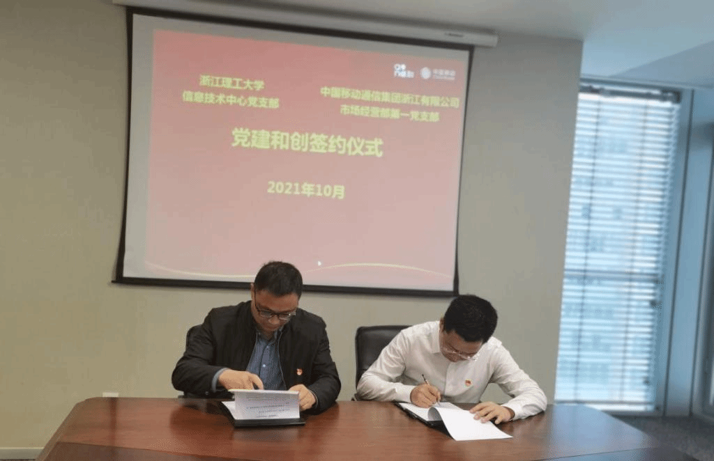 10月27日下午,浙江理工大学信息技术中心党支部与中国移动通信集团浙江有限公司市场经营部第一党支部校企“党建和创”签约仪式在浙江移动通信大厦2015会议室举行。