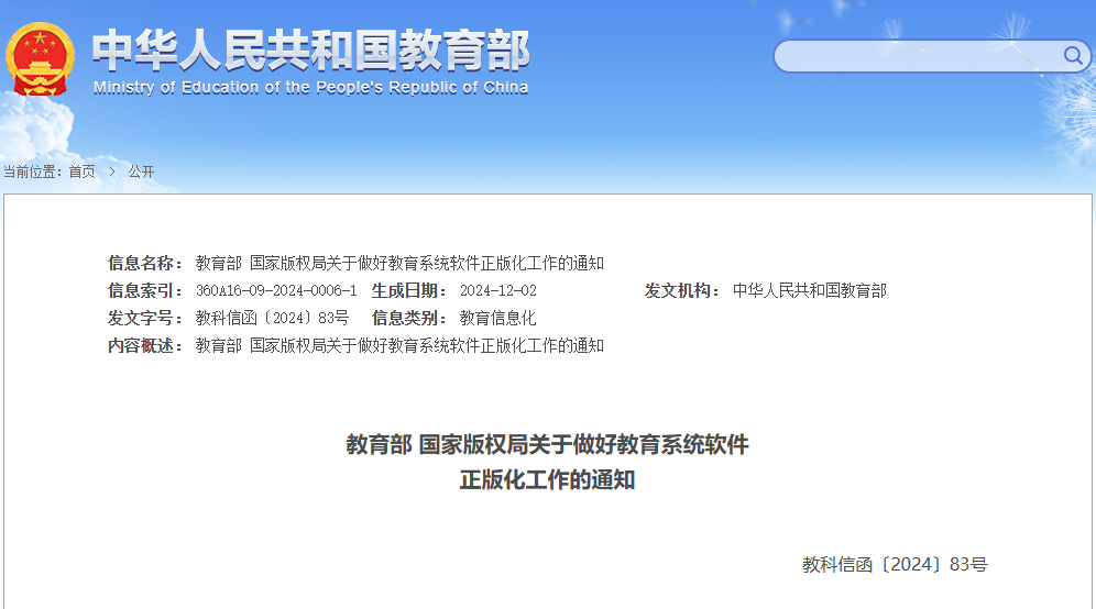 近日,教育部、国家版权局联合印发《关于做好教育系统软件正版化工作的通知》,明确进一步完善教育系统软件正版化工作长效机制,推进教育系统软件正版化工作规范化、常态化、制度化。具体内容一起了解——