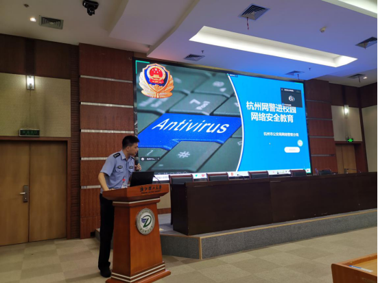 9月5日,杭州钱塘区公安分局网警大队民警陈超峰为外国语学院2022级新生作网络安全专题讲座