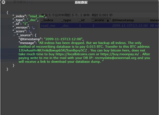 接部局通报,工作中发现有黑客利用Elasticsearch服务器存在未授权访问漏洞,攻击入侵暴露在互联网上的Elasticsearch系统,实施数据窃取和勒索。攻击者删除Elasticsearch数据库中部分数据,插入名为“read_me”的“勒索信”(见附件),告知用户支付0.015比特币索回被删除数据,并附比特币收款地址、联系邮箱地址以及比特币购买网址等信息。