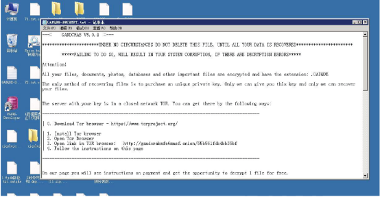 勒索病毒加密文件的最终目的是索要赎金,所以会在系统明显位置如桌面上留下文件提示,或将勒索图片更改为桌面。勒索信绝大多数为英文,引导被勒索的用户交赎金。