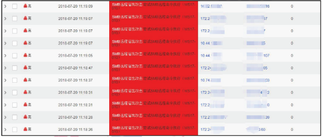 如果使用了监测系统进行流量分析、威胁监测,系统产生大量告警日志,例如“SMB 远程溢出攻击”、“弱口令爆破”等,可能是病毒在尝试扩散。