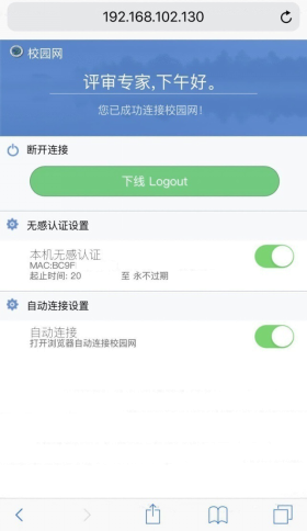 3.认证成功后就可以访问校园内网和互联网了。目前学校已开启无感知MAC快速认证上网,即在一次成功认证后,后续可以免认证快速上网。若需要手动下线时,请点击页面上的“下线Logout”按钮下线。