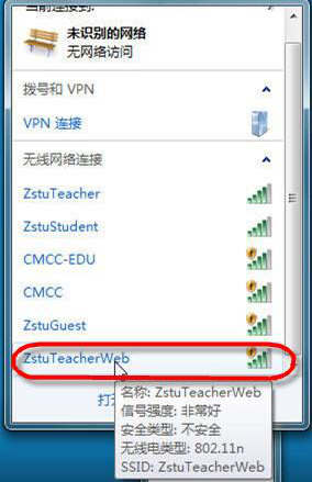 1.当您使用移动端(手机)或PC端(笔记本)接入我校校园无线网络时,首先请您选择连接热点信号:教师用户选择“ZstuTeacherWeb”,学生用户选择“ZstuStudentWeb”。