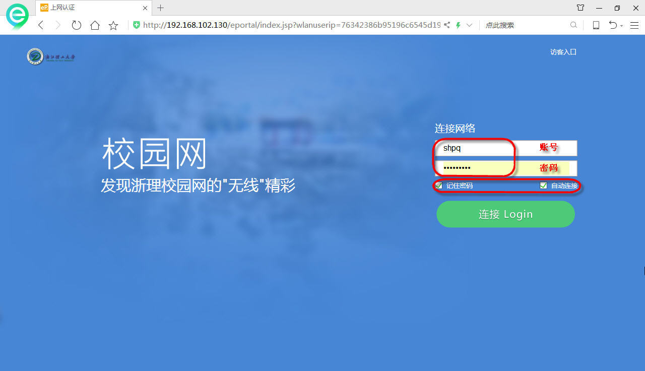 2.在认证页面中,请输入校园统一身份认证平台的账号和密码,手动选择启用“自动连接”选项,最后点击“连接Login”进行实名认证上网。