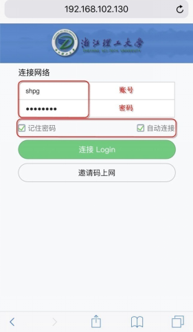 特别说明:个别终端系统若没有自动推送认证页面,可以手动打开浏览器,在地址栏输入任意网址,页面将会自动跳转至浙江理工大学无线网络认证页面。