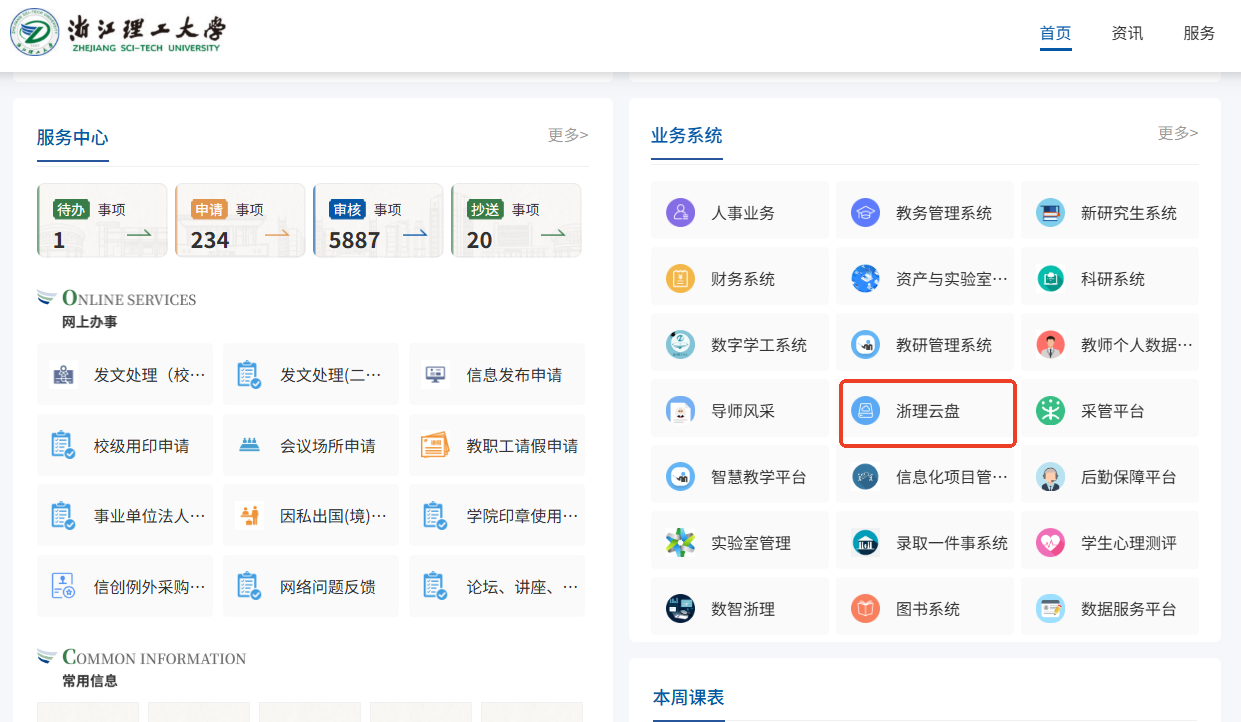 2.登录校内办公信息门户(s.zstu.edu.cn)点击“业务系统”中的“浙理云盘”图标。