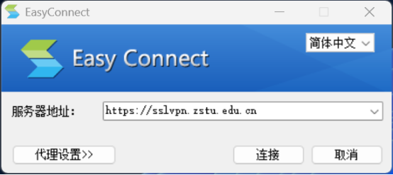 4.如果电脑上已经安装过了EasyConnect软件,也可以直接双击EasyConnect图标运行。在服务器地址一栏中,输入https://sslvpn.zstu.edu.cn或者http://115.236.14.200(电信用户)或者http://101.68.71.52(联通用户),点击“连接”。