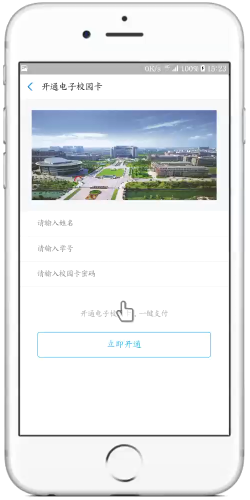 2、进入“开通电子校园卡”界面,输入您本人的姓名、学号、校园卡密码(默认为证件号后6位,非数字0代替),点击“立即开通”即可。如右图: