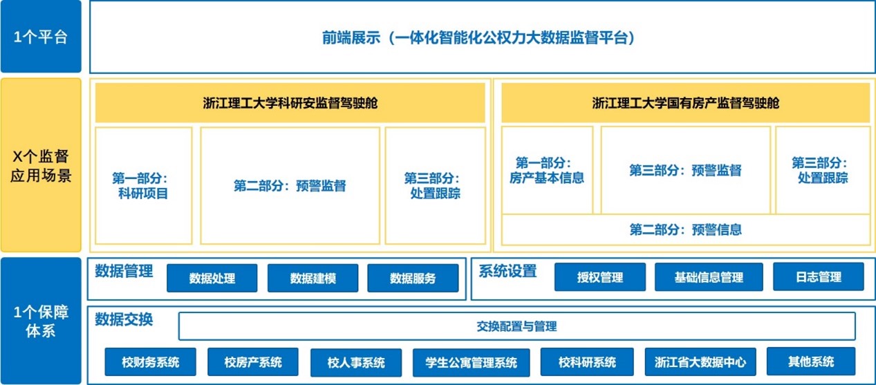 学校以“国有房产”大数据监督试点建设为契机,做好顶层设计,将开发环境、应用集成和安全审计功能服务化,创新建成“1X1”架构的数智监督平台,即建设1个一体化监督平台,打造房产、科研、重大事项监督等多个重点领域应用场景,构建1个公权力监督数据池。