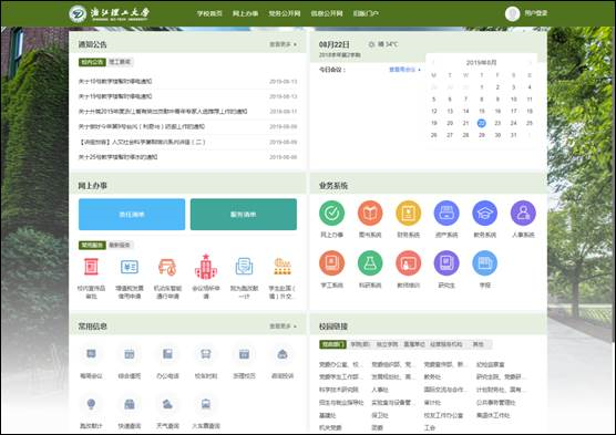 1.校内信息门户。“校内信息门户”汇集了校内各类信息内容,是校内信息集中展示和服务的平台,也是校内各业务系统和各学院、部门网站的统一入口。