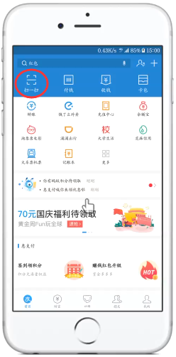 第一步:打开“支付宝APP”,点击“扫一扫”按钮,扫描下方二维码,进入支付宝服务授权界面,点击确认授权。