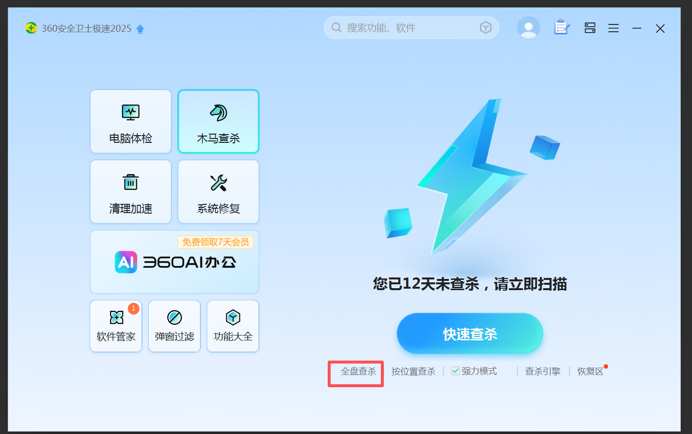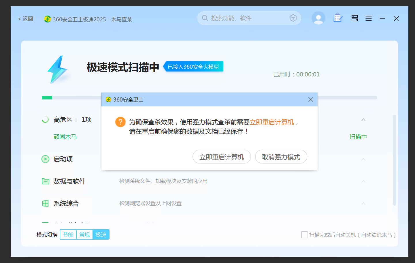 4. 勾选强力模式,然后点击全盘查杀,会弹出提示框电脑需要重启,点击立即重启计算机。