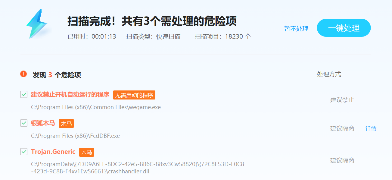 6. 查杀完成后需先对查杀结果截图存档,和情况说明报告一起移交给信息技术中心,点击一键处理,查杀完成后建议重启电脑后再进行一次强力模式全盘查杀。