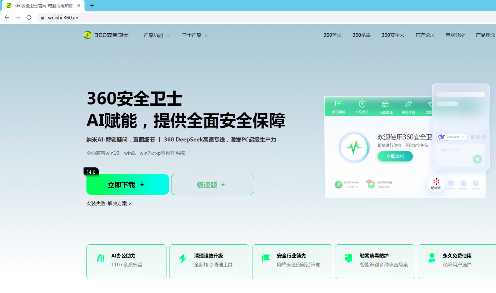 1. 访问360安全卫士主页:weishi.360.cn,推荐下载极速版,后面截图也以极速版为例。