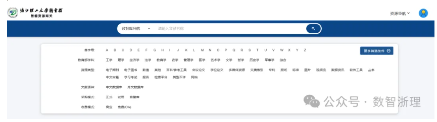 step2 登录成功后,可使用智能资源网关的数据库导航。点击“更多筛选条件”,可提供按照首字母、教育部学科、资源类型、文献语种、采购模式、收费模式等条件进行数据库筛选,也支持多条件筛选。