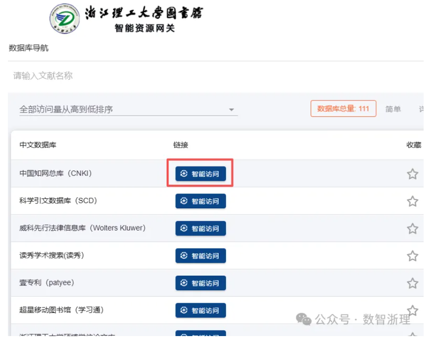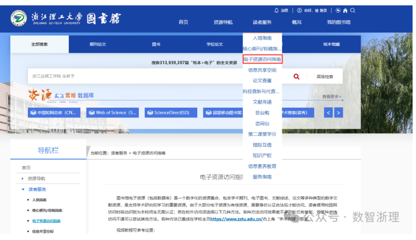登录浙江理工大学图书馆网站,进入页面后从“读者服务”下拉菜单“电子资源访问指南”点击进入智能资源网关。根据