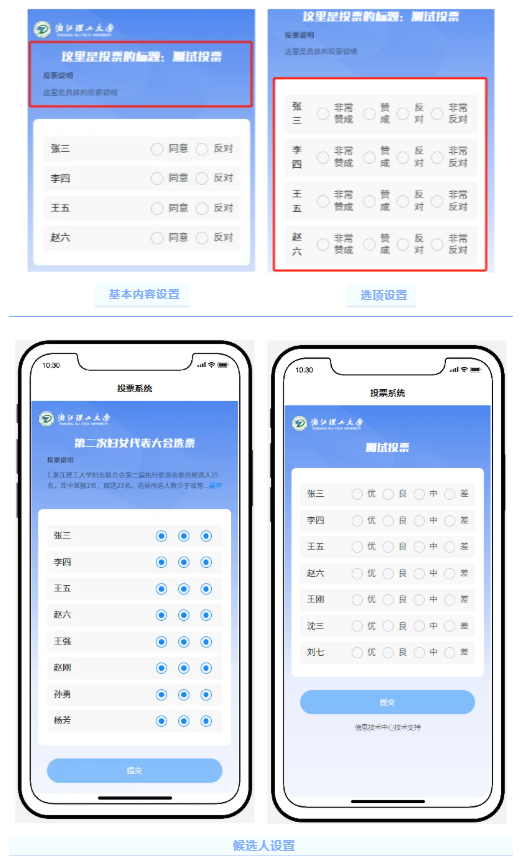 1. 自定义投票名称、候选人名单、投票规则及界面布局。