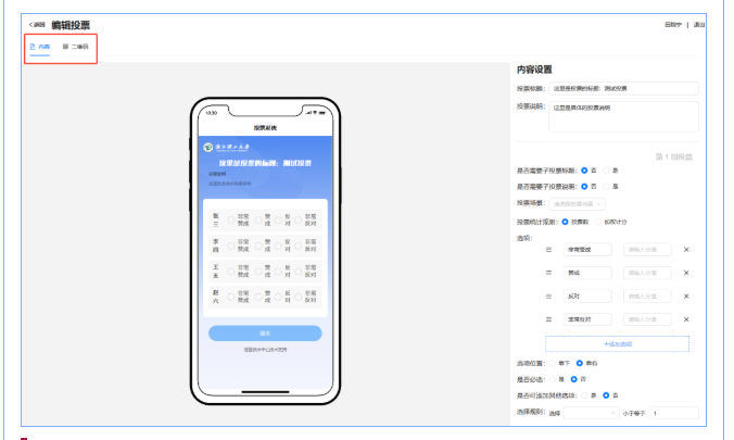 投票基本内容设置,包括投票标题、投票场景(等额/差额/评比)、投票规则(投票数/加权积分)等设置;选项内容、选项位置、选项数量规则等设置。