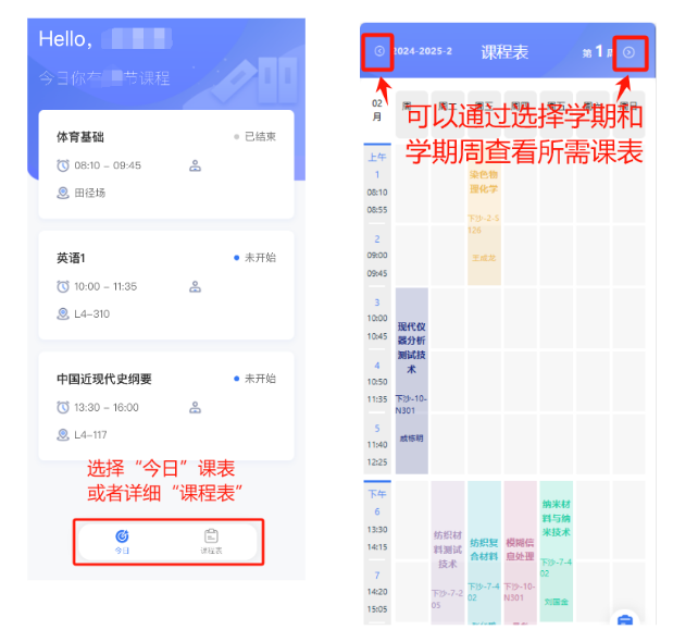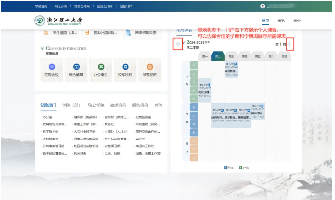 2. 登录后,门户右下方展示个人课表模块,可通过选择学期和学期周展示所需课表。