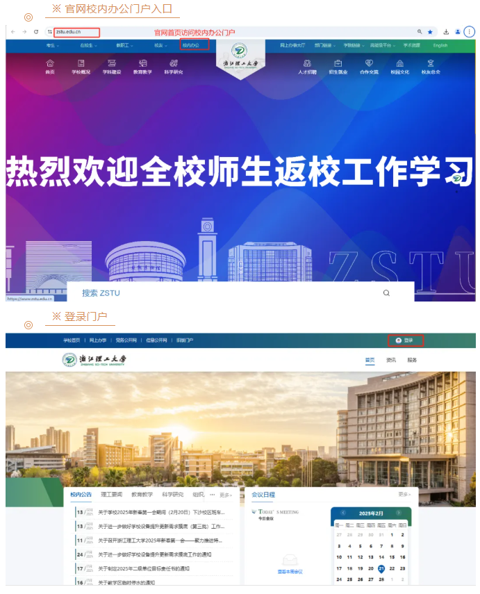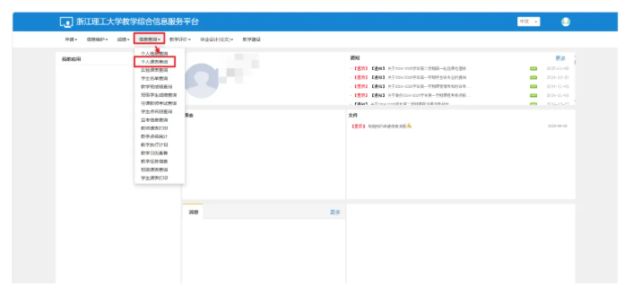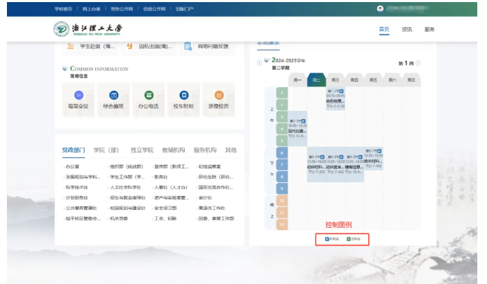 1. 登录网页端校内办公门户,门户右下方展示个人课表模块。通过官网“校内办公”入口进入门户或直接访问门户https://s.zstu.edu.cn。
