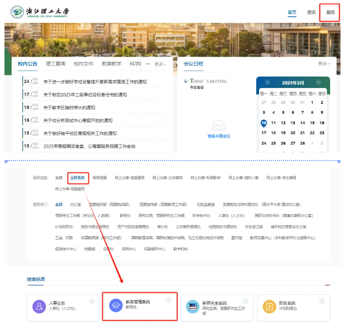 或门户首页右上角,服务→业务系统→教务管理系统。