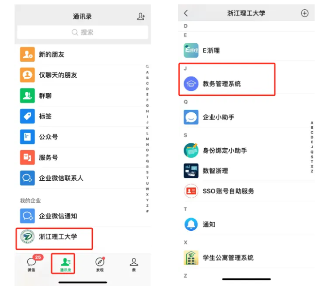 访问方式:微信通讯录→我的企业→浙江理工大学→教务管理系统。
