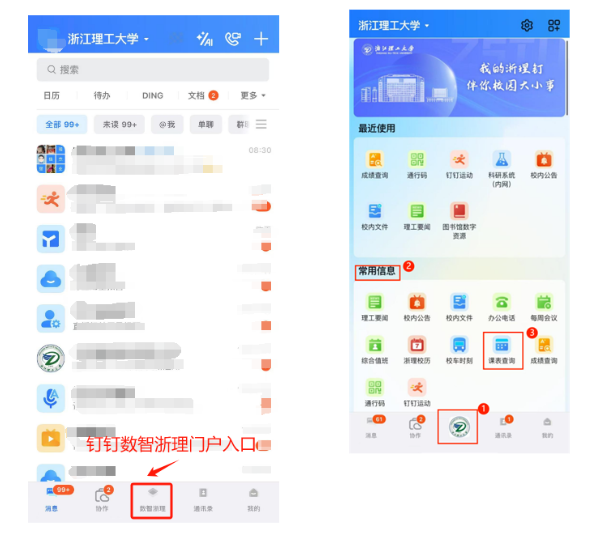 进入钉钉工作台数智浙理入口→常用信息→课表查询,详细查课表。